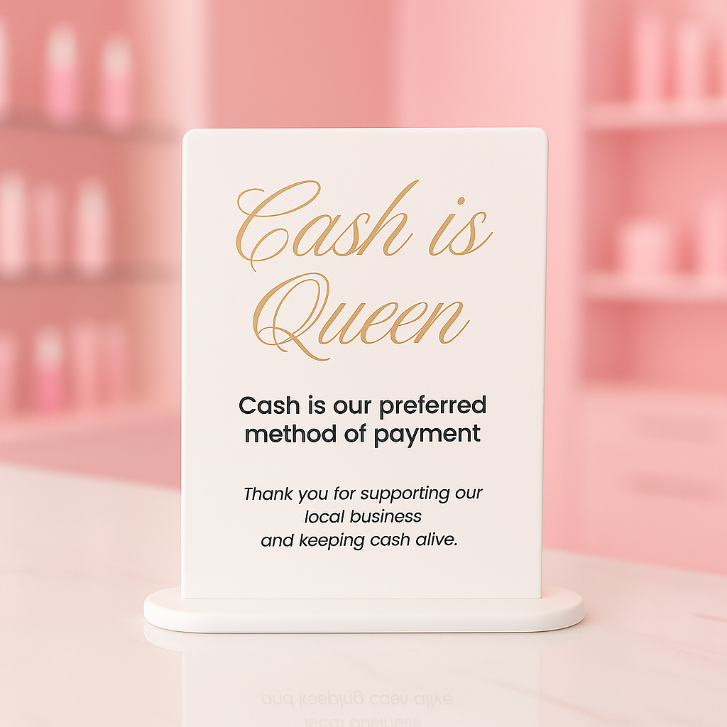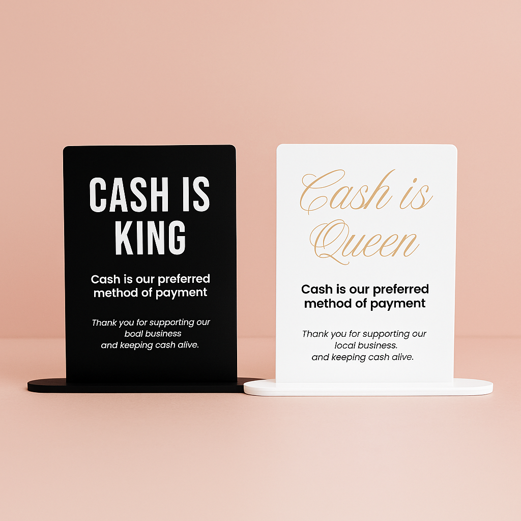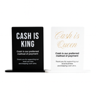 A modern reminder that cash still counts. Our Cash Is King acrylic sign is designed for businesses who value cashflow, choice and customer ease. Crafted in black or white acrylic, it’s perfect for counters, reception desks and salon stations
