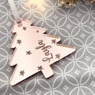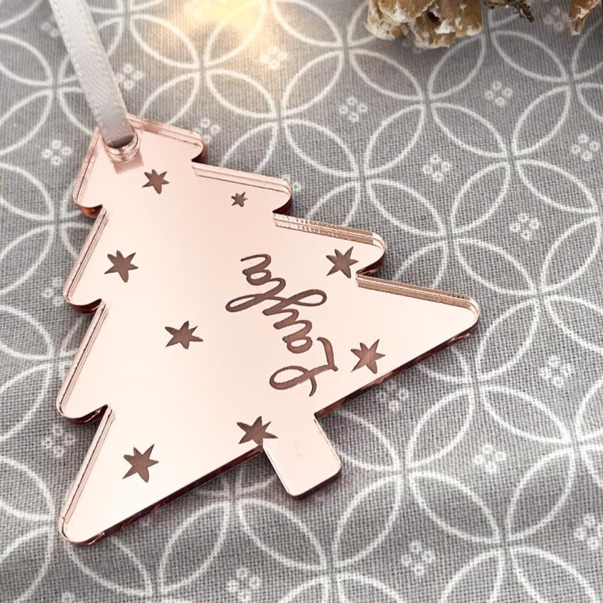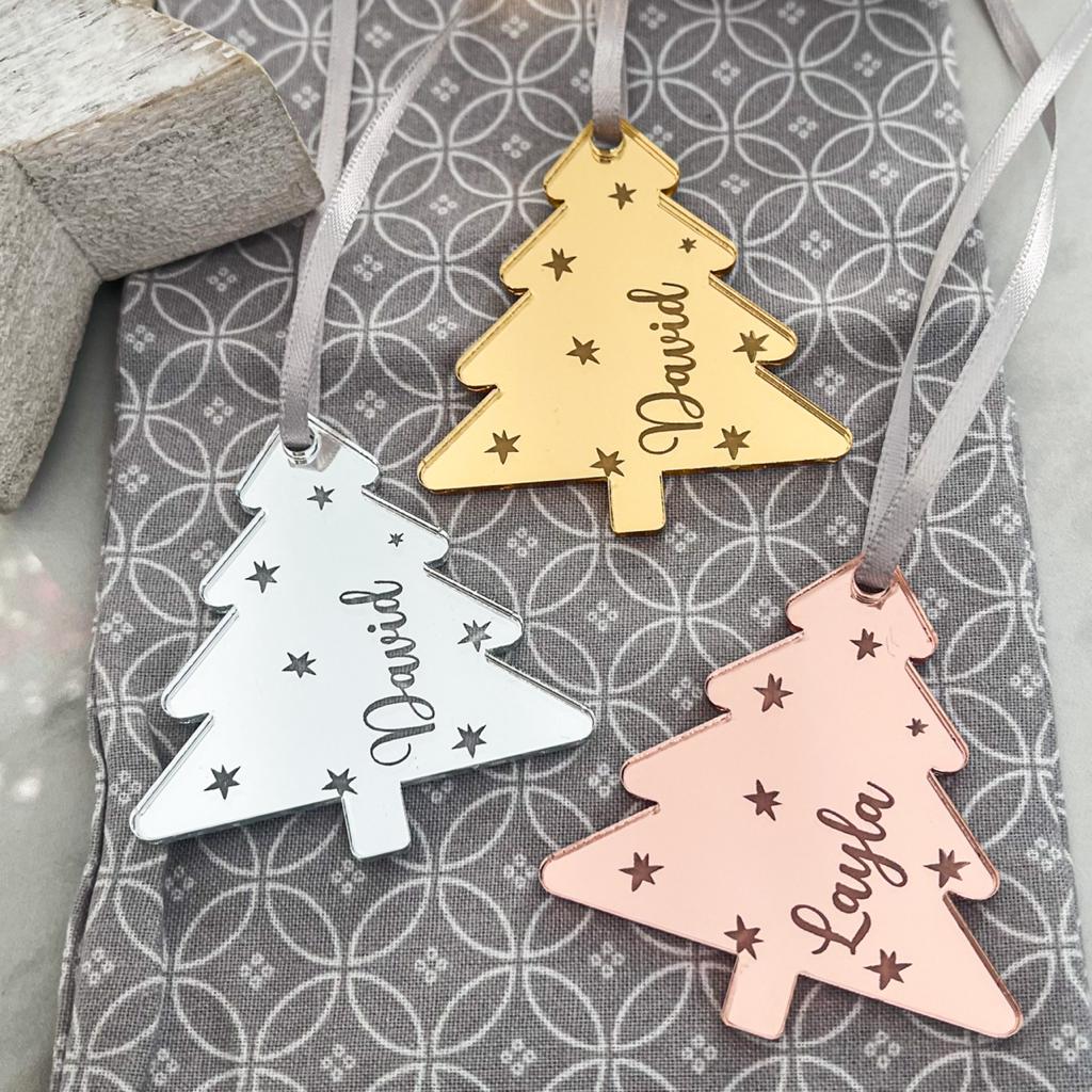 Luxury Luxury Christmas Tree Engraved Place Name by PrintLux — crafted from Clear acrylic, Frosted acrylic, Gold mirror, Rose gold mirror, Silver mirror and available in a range of sizes.