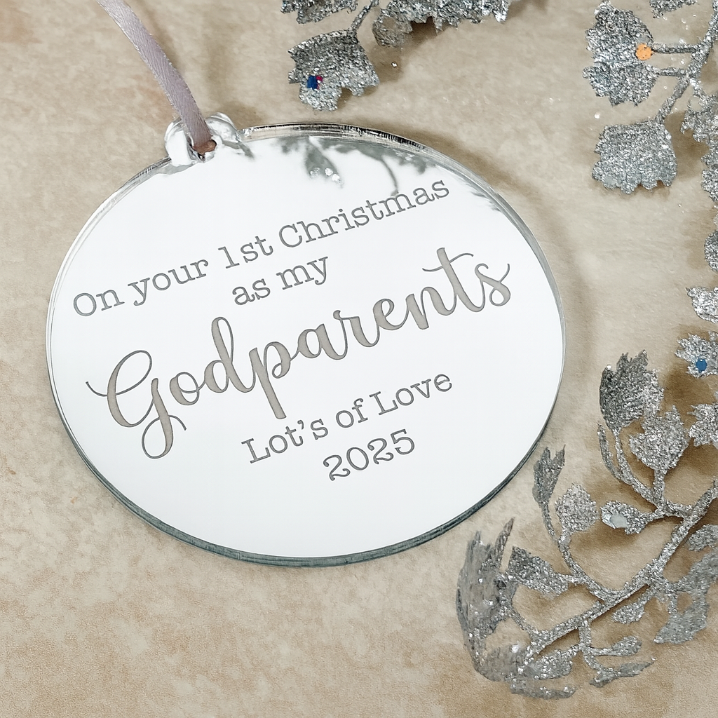 Luxury Luxury Personalised Christmas Bauble - 1St Christmas As My Godparents Personalised Bauble by PrintLux — crafted from Clear acrylic, Frosted acrylic, Gold mirror, Rose gold mirror, Silver mirror, Wood and available in 10cm, 6cm, 8cm.