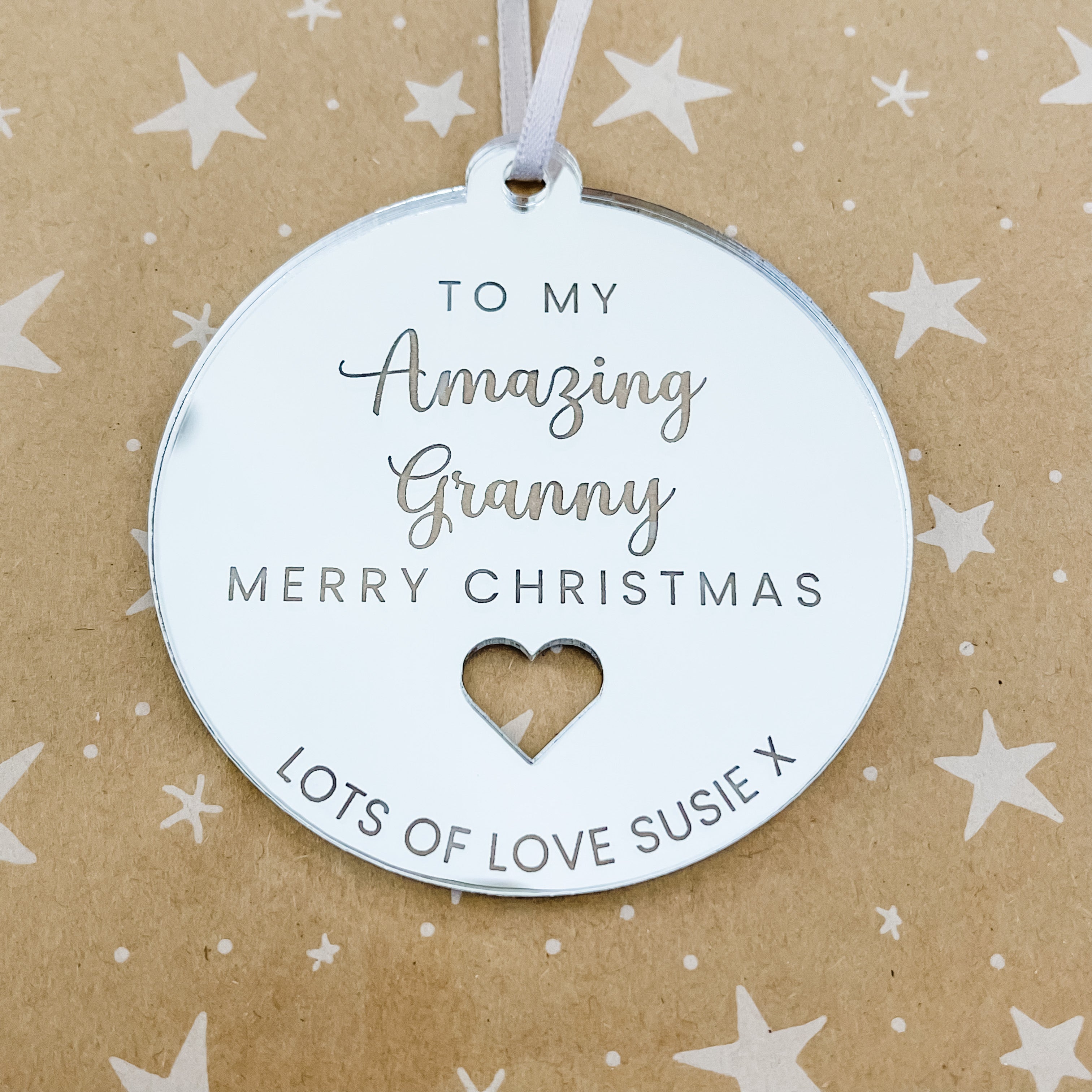 Luxury Luxury Amazing Granny Christmas Bauble - Personalised Christmas Ornament by PrintLux — crafted from Clear acrylic, Frosted acrylic, Gold mirror, Rose gold mirror, Silver mirror, Wood and available in 10cm, 6cm, 8cm.