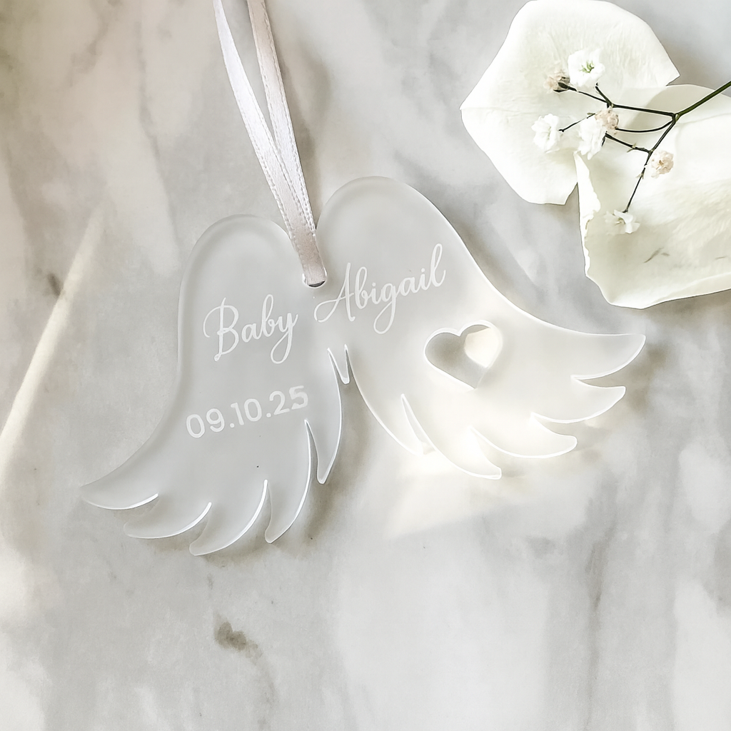 Luxury Luxury Baby Angel Wings Hanging Ornament by PrintLux — crafted from Clear Acrylic, Frosted Acrylic, Gold Mirror, Rose Gold Mirror, Silver Mirror, Wood and available in a range of sizes.