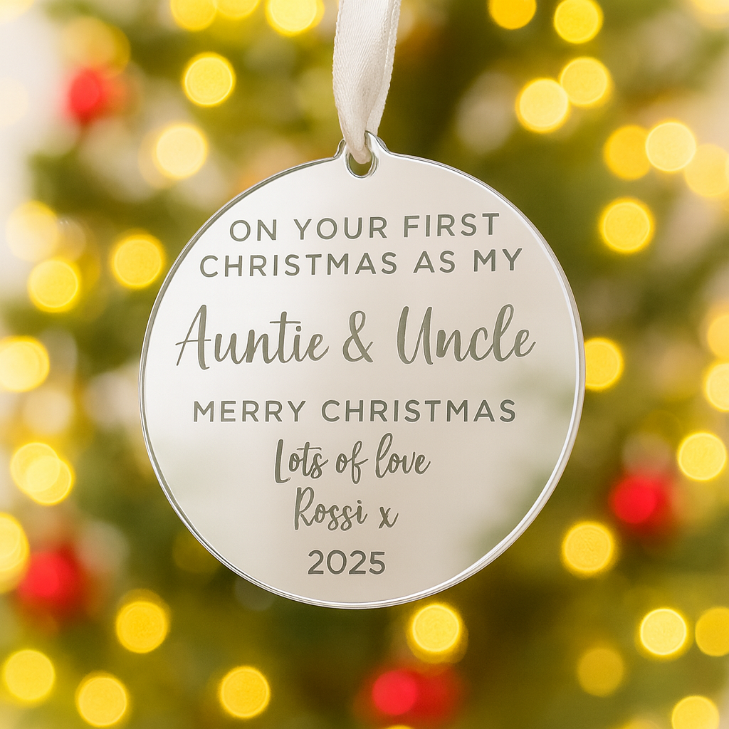 Luxury Luxury Our First Christmas Together Bauble - Personalised Couple Ornament by PrintLux — crafted from Clear acrylic, Frosted acrylic, Gold mirror, Rose gold mirror, Silver mirror, Wood and available in 10cm, 6cm, 8cm.