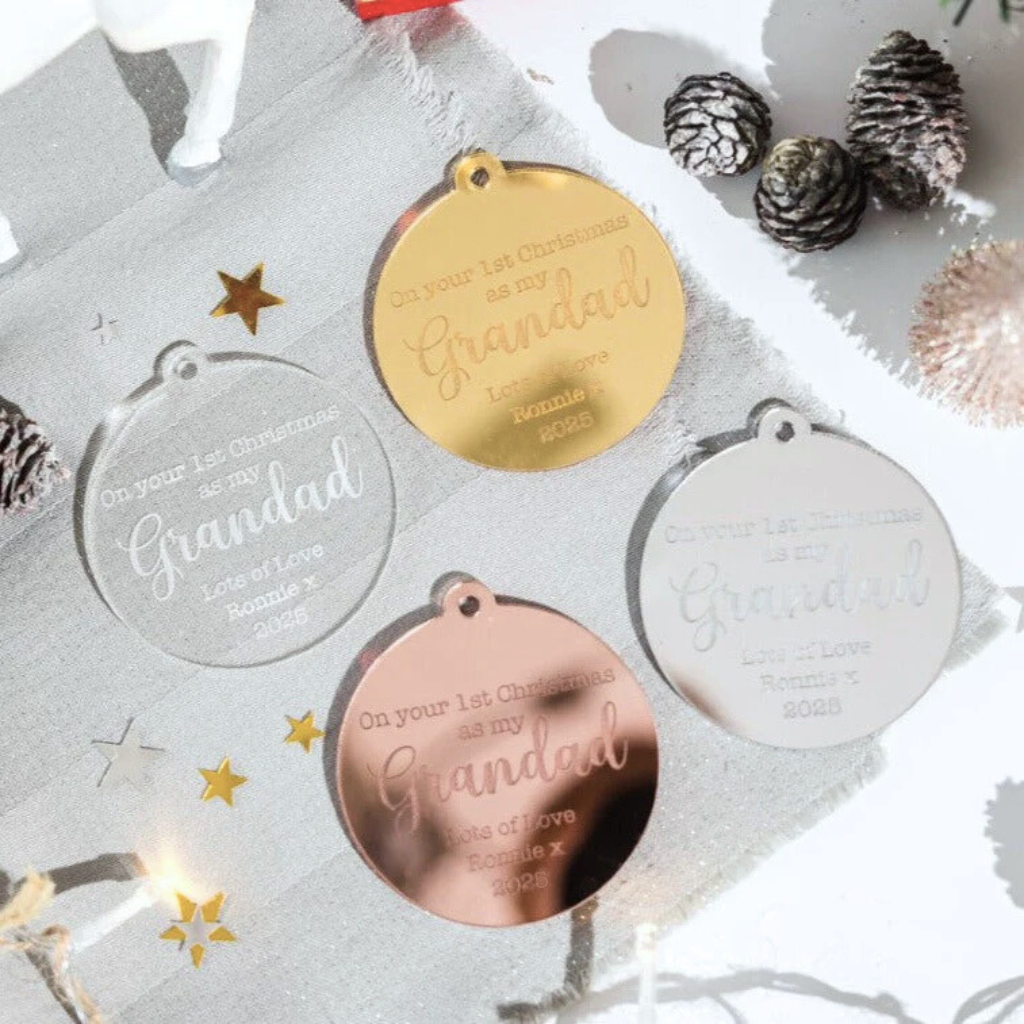 Luxury Luxury Our First Christmas Together Bauble - Personalised Couple Ornament by PrintLux — crafted from Clear acrylic, Frosted acrylic, Gold mirror, Rose gold mirror, Silver mirror, Wood and available in 10cm, 6cm, 8cm.