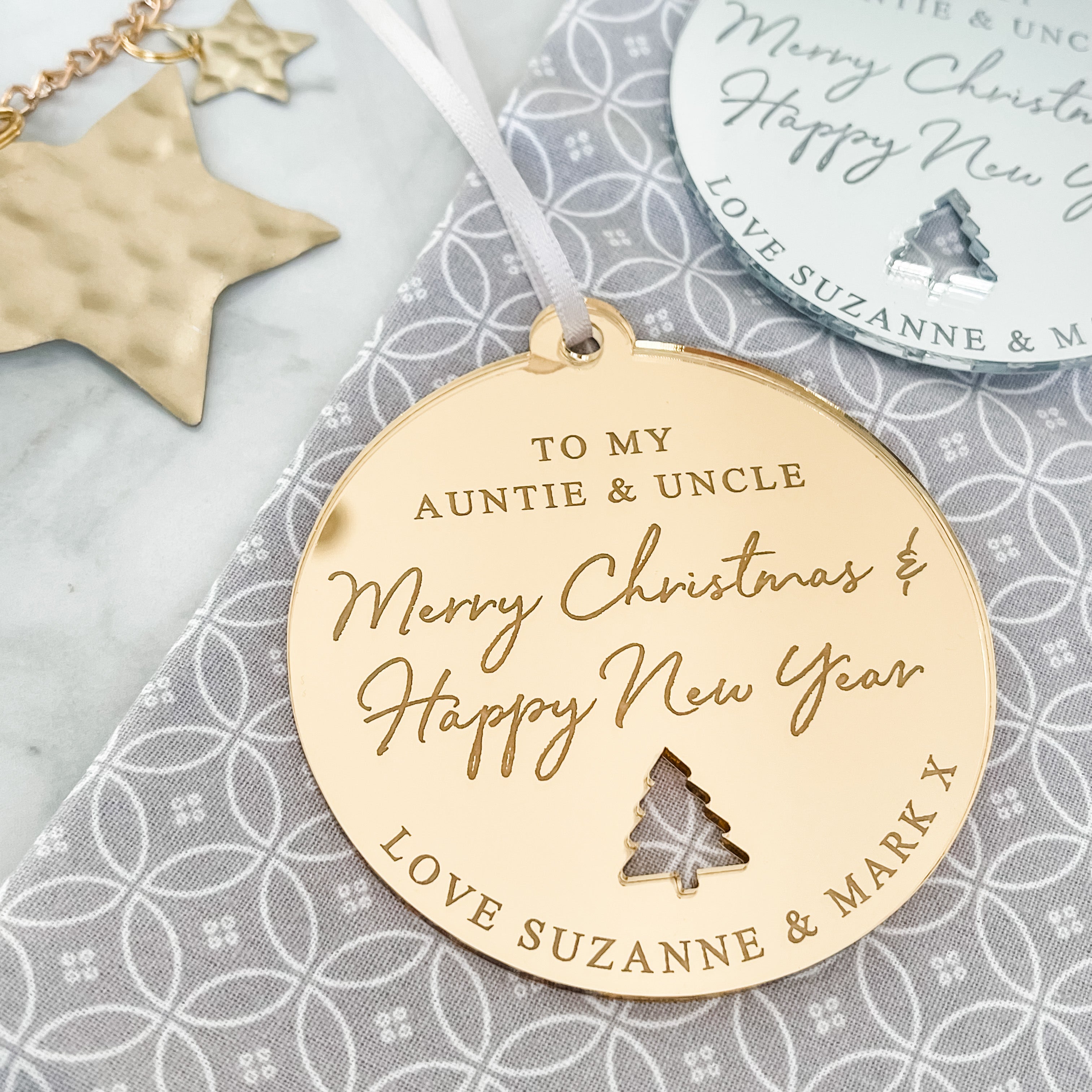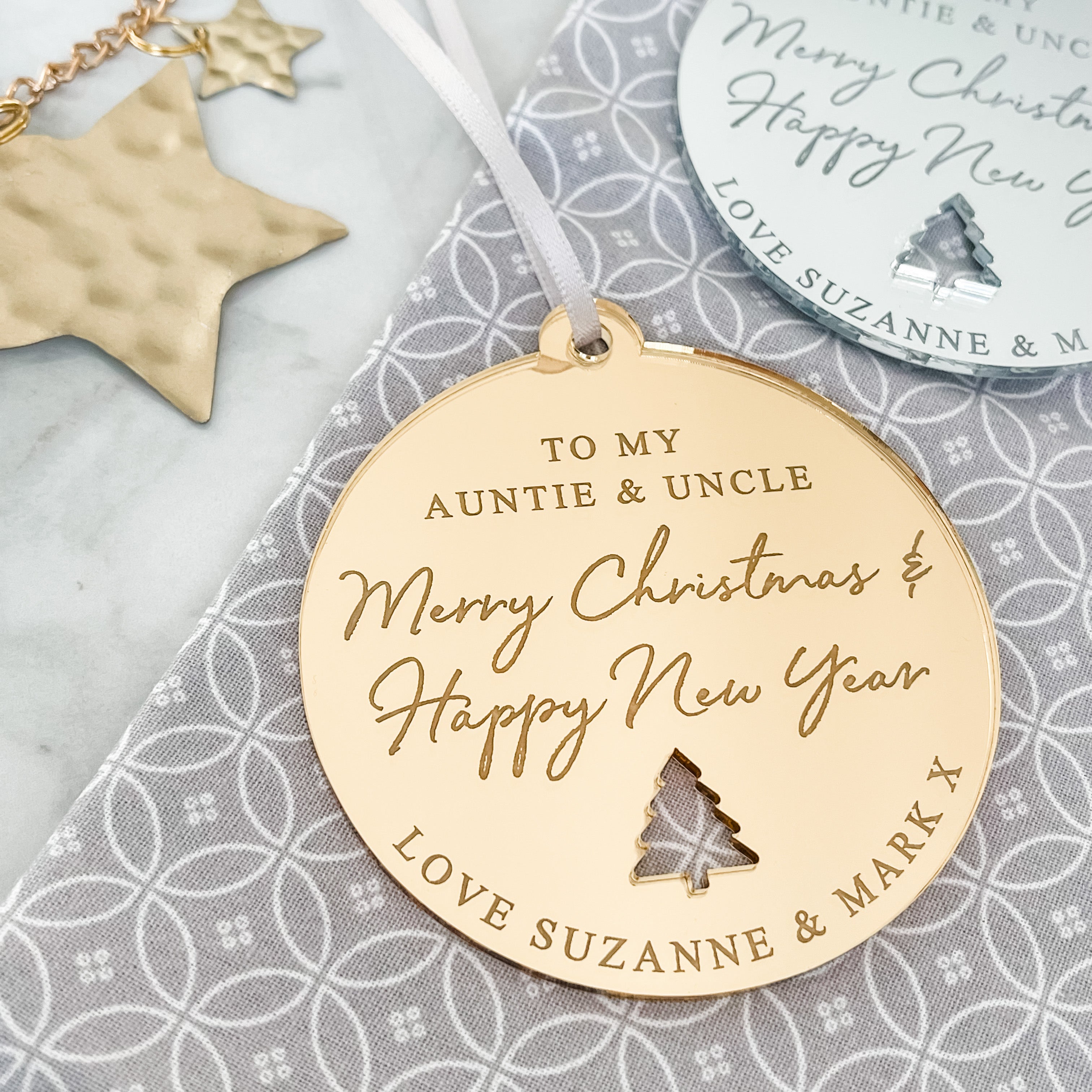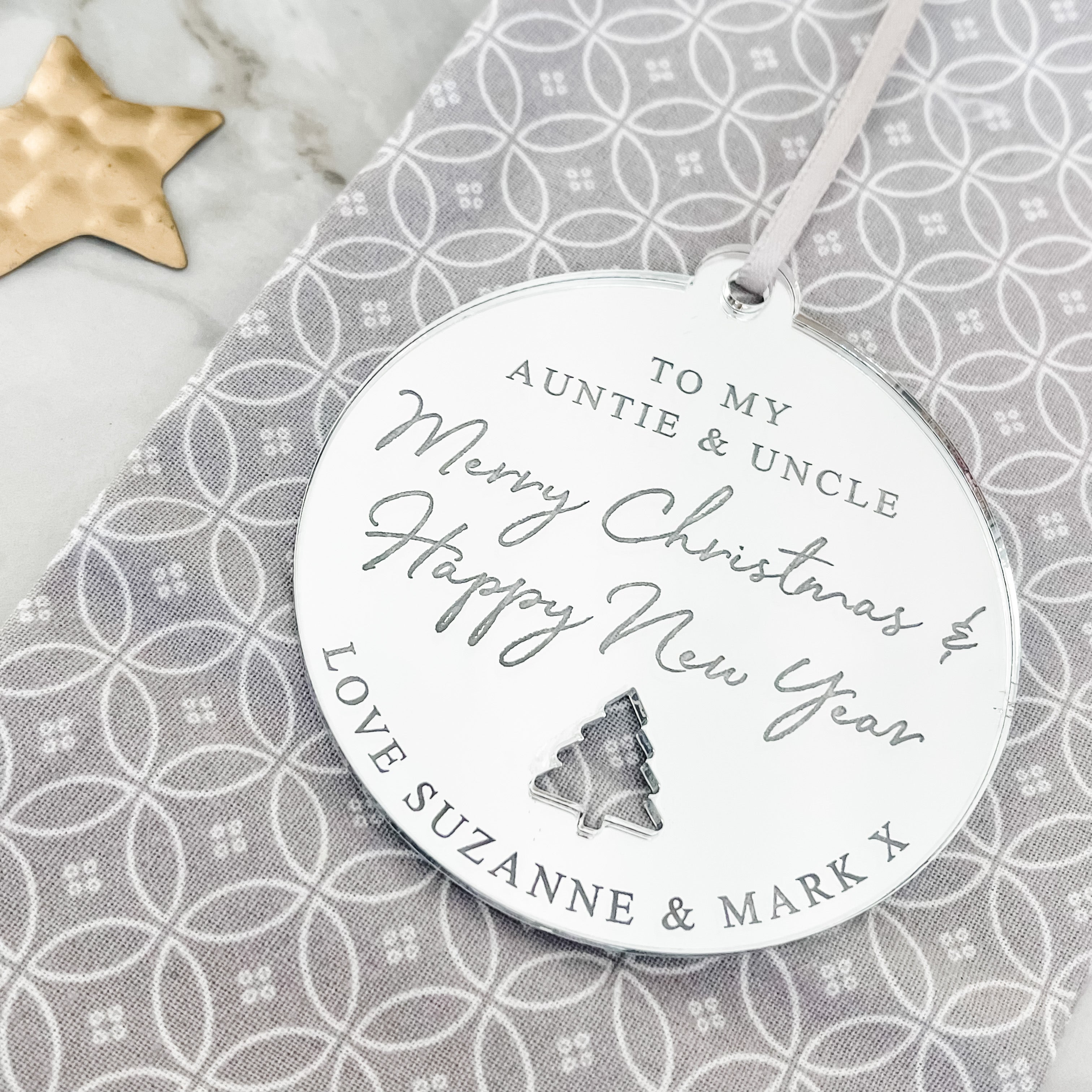 Luxury Luxury Merry Christmas Auntie & Uncle Bauble - Personalised Christmas Ornament by PrintLux — crafted from Clear acrylic, Frosted acrylic, Gold mirror, Rose gold mirror, Silver mirror, Wood and available in 10cm, 6cm, 8cm.