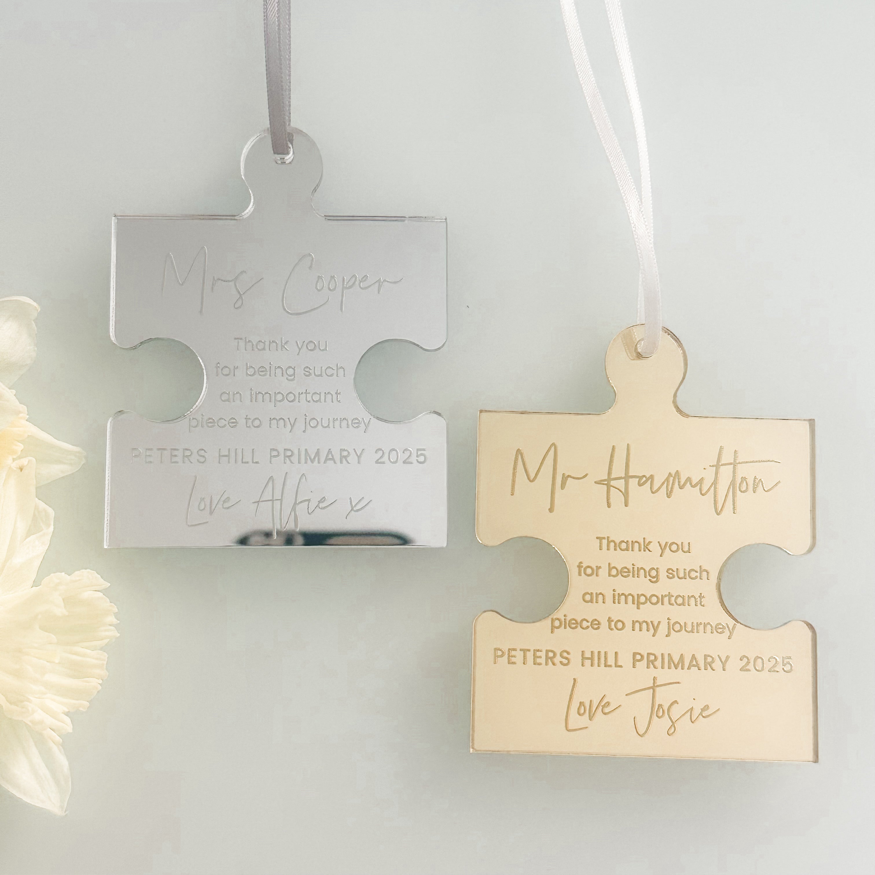 Luxury Luxury Personalised Teacher Thank You Gift | Jigsaw Hanging Tag Keepsake by PrintLux — crafted from Clear acrylic, Frosted acrylic, Gold mirror, Rose gold mirror, Silver mirror, Wood and available in a range of sizes.