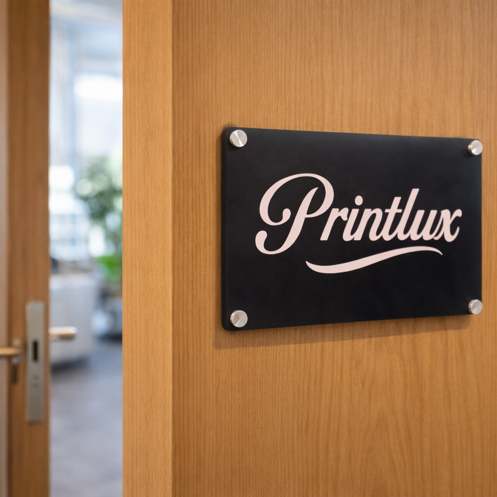 Acrylic – A premium, glossy material that gives a sleek and modern look. Available in various colours and finishes, including clear, frosted, black and beige. Often used for office signs, illuminated signage, and high-end branding.