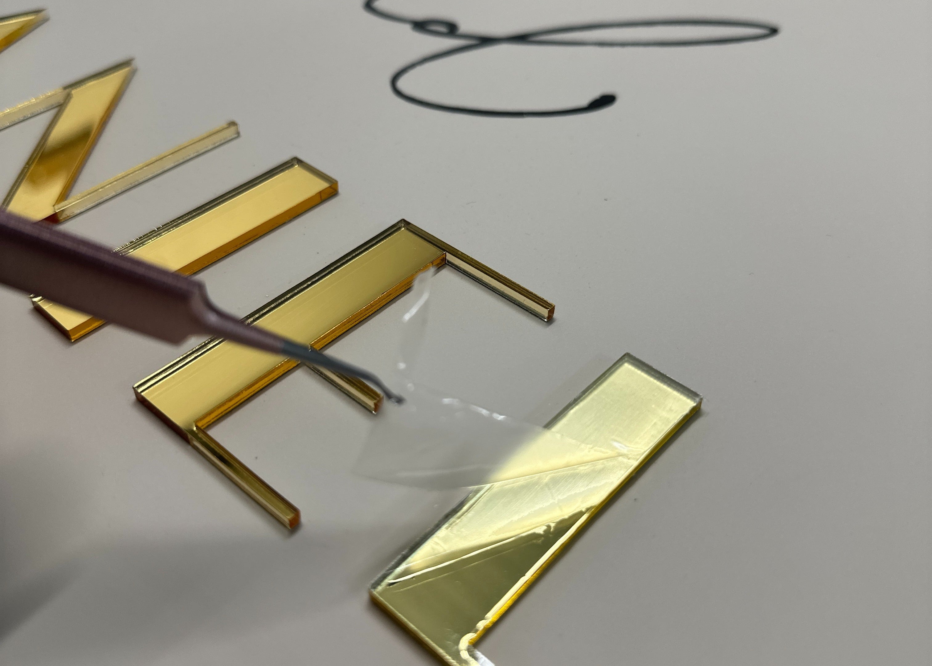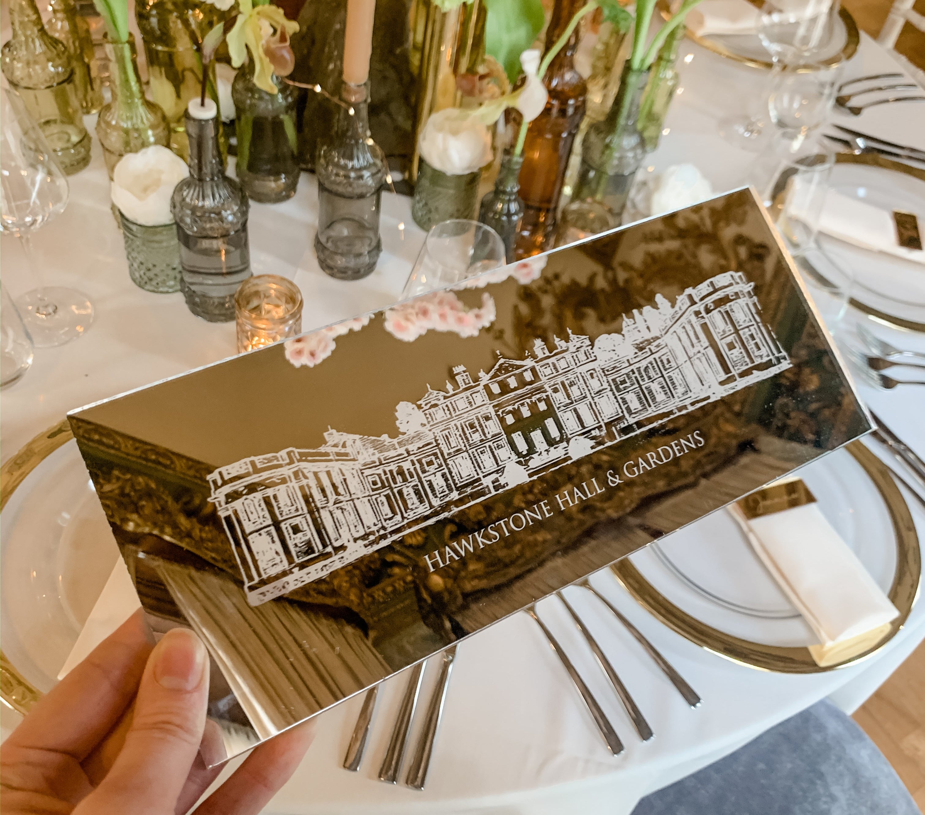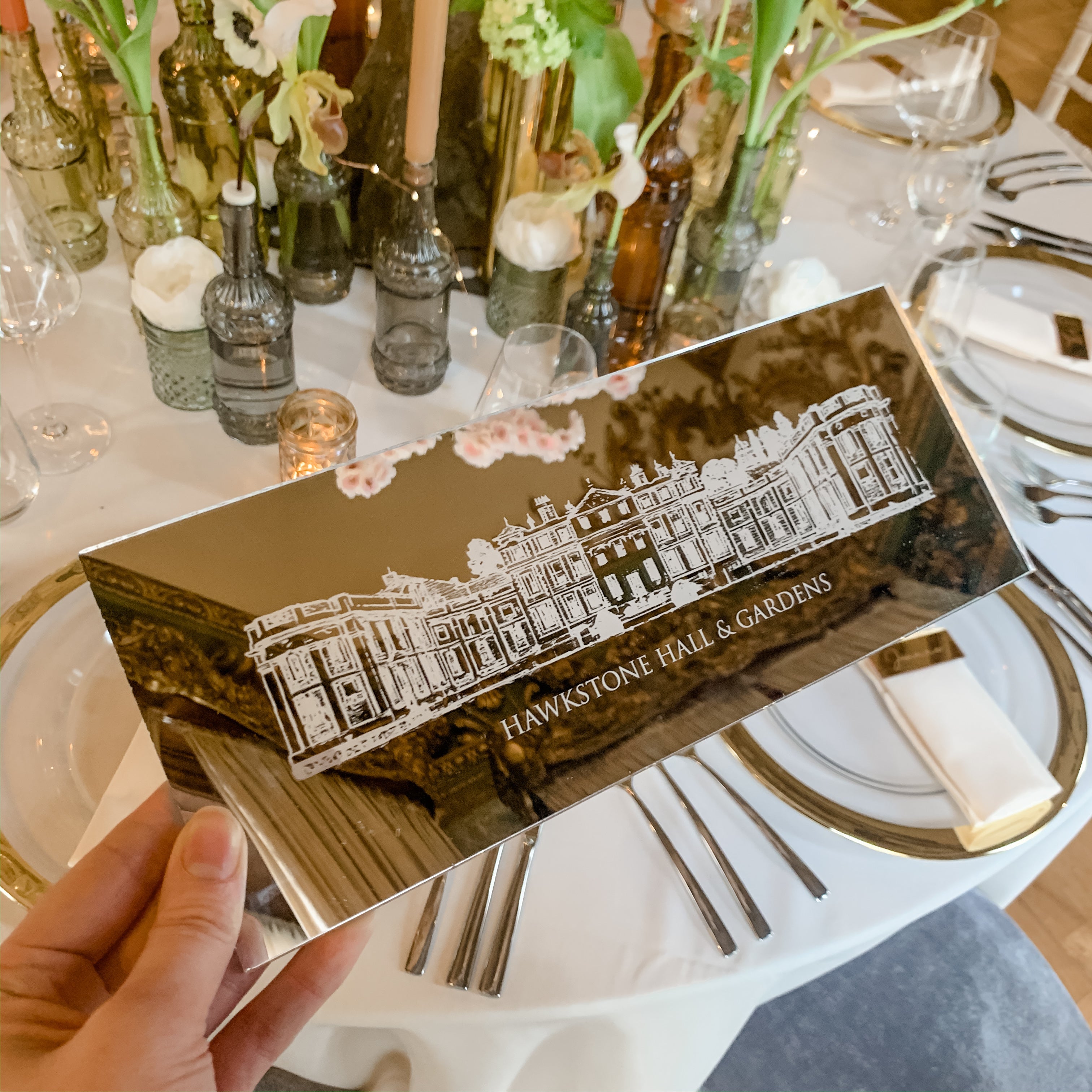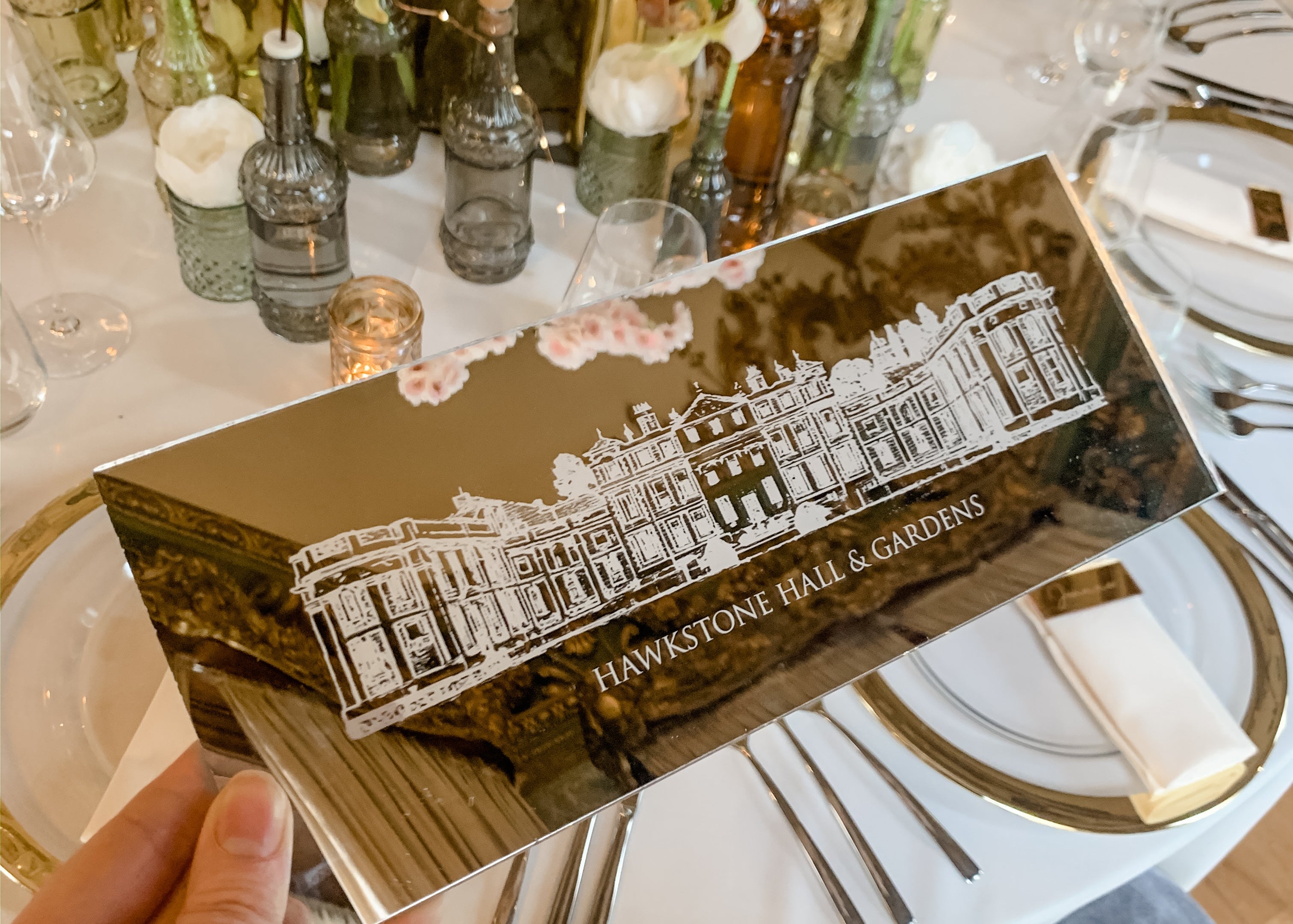 Our engraving process offers a unique and elegant alternative to printing. Using advanced techniques, we engrave your design directly into mirrored material, creating a stunning, reflective finish. This process adds depth and sophistication, giving your wedding signage and accessories a beautifully timeless and personalised touch.