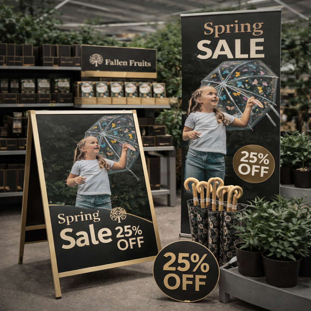 Fast-turnaround promotional signage including sale window kits, POS boards, hanging signs and campaign graphics. Perfect for seasonal promotions and product launches.