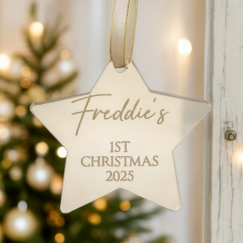 Luxury Luxury Baby’s First Christmas Bauble - Personalised Keepsake Ornament by PrintLux — crafted from Clear acrylic, Frosted acrylic, Gold mirror, Rose gold mirror, Silver mirror, Wood and available in 10cm, 6cm, 8cm.