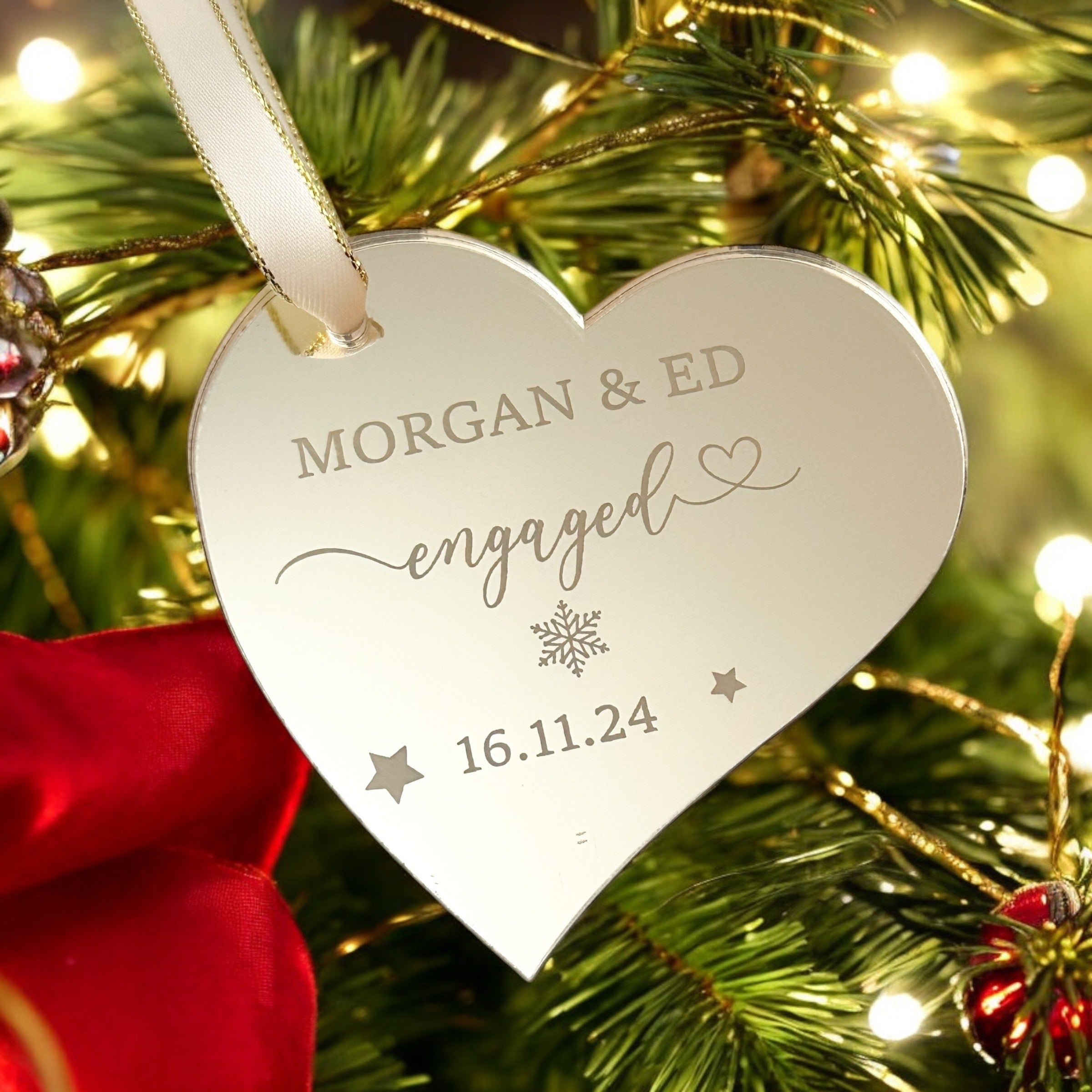 Luxury Luxury Engaged Personalised Christmas Heart Decoration by PrintLux — crafted from Clear acrylic, Frosted acrylic, Gold mirror, Rose gold mirror, Silver mirror, Wood and available in 10cm, 6cm, 8cm.