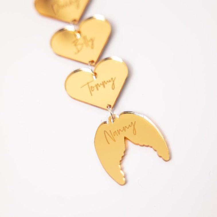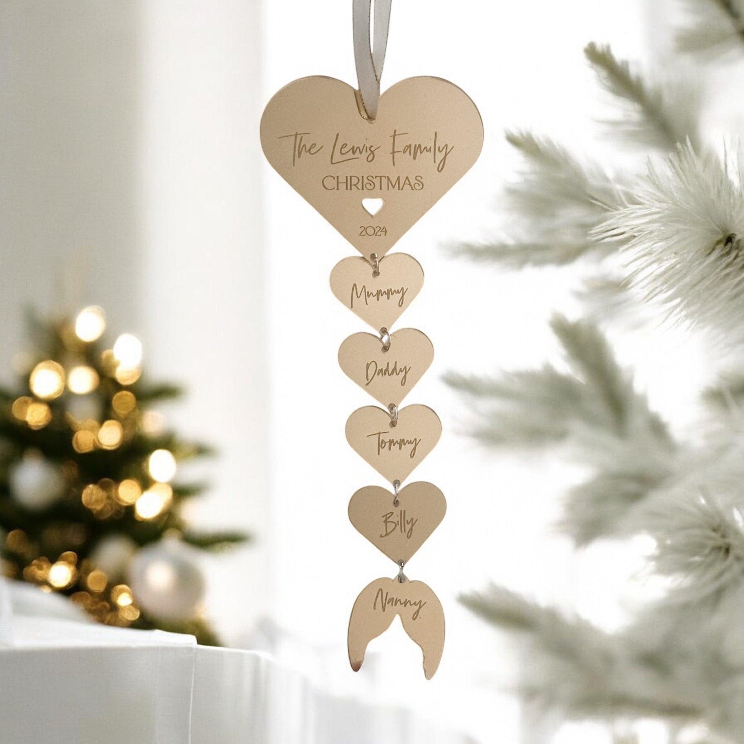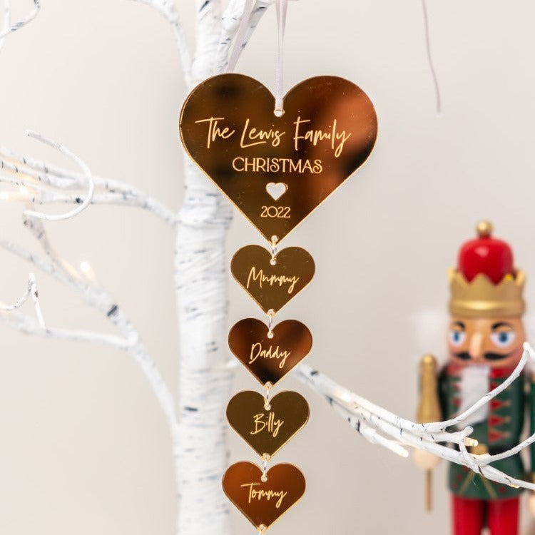 Luxury Luxury Family Christmas Hanging Heart Decoration – Personalised Design by PrintLux — crafted from Clear acrylic, Frosted acrylic, Gold mirror, Rose gold mirror, Silver mirror, Wood and available in a range of sizes.