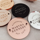 Luxury Luxury Personalised Button Tag - Acrylic Circular Tags with Sew Holes in a Pack of 5 by PrintLux — crafted from Gold Mirror, Red Mirror, Rose Gold Mirror, Silver Mirror, Teal Mirror, Wood and available in a range of sizes. Personalisation and colour options include Beige, Black, Clear, Green, Grey, Grey & Black Marble, Light grey, Navy, Pink, Teal Frosted, White.