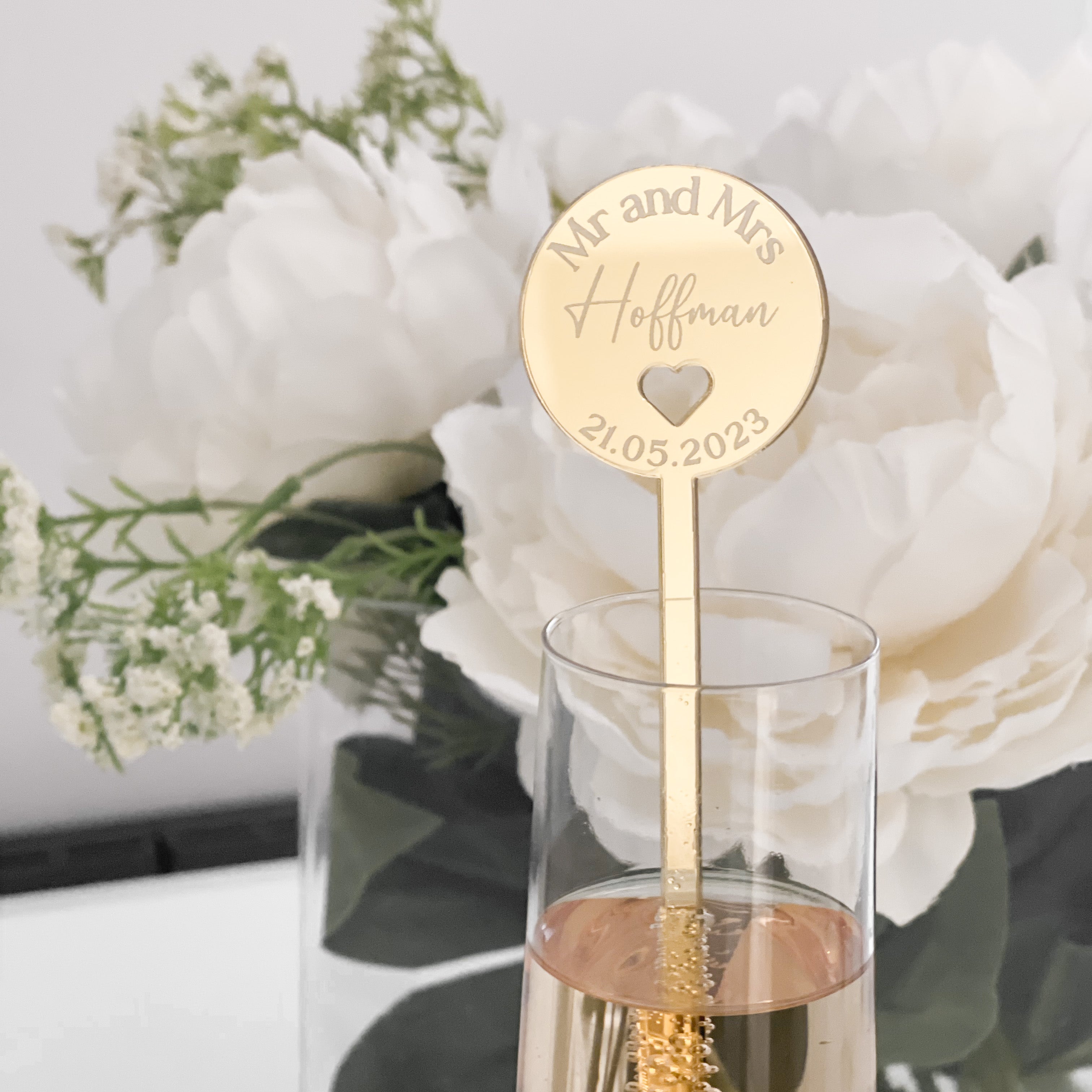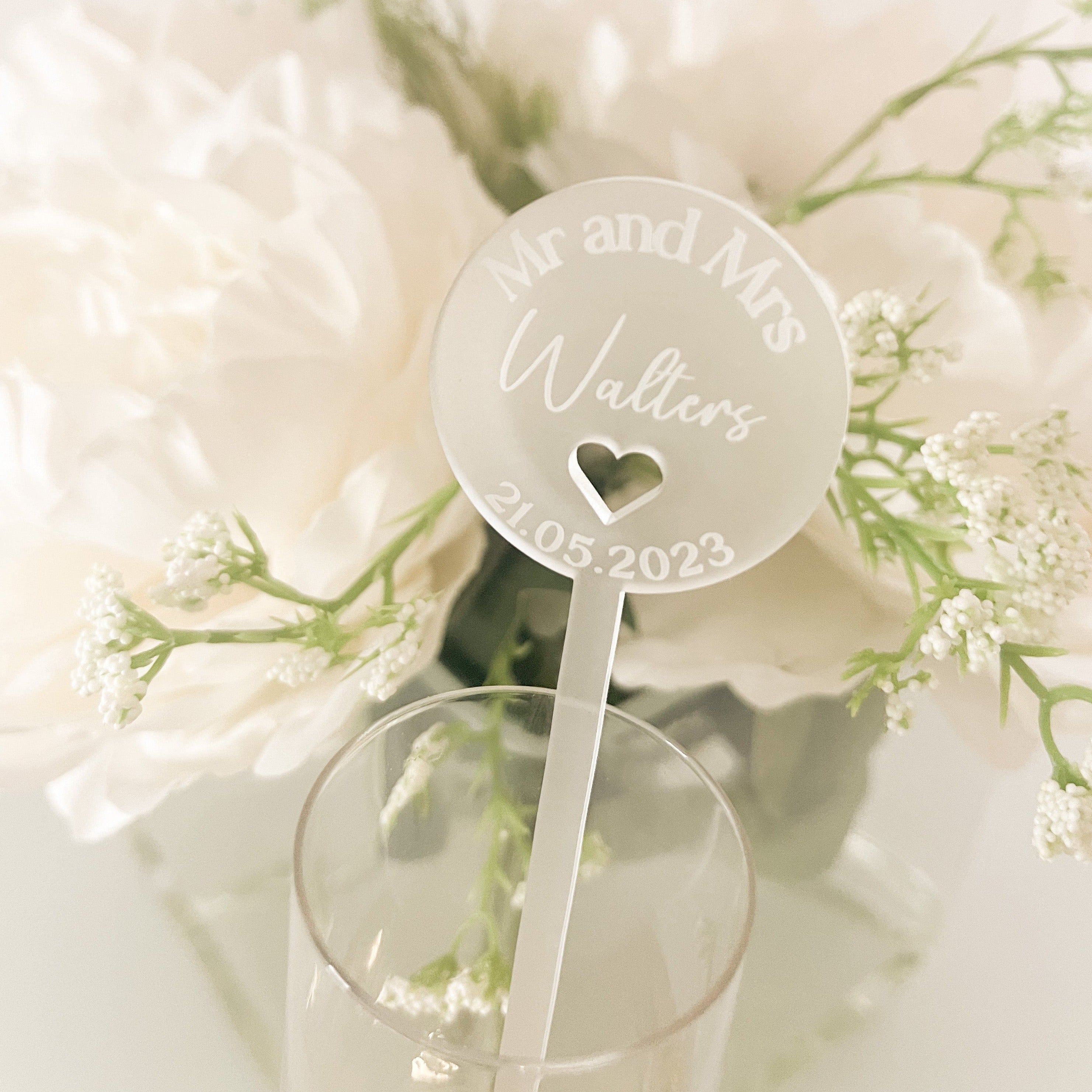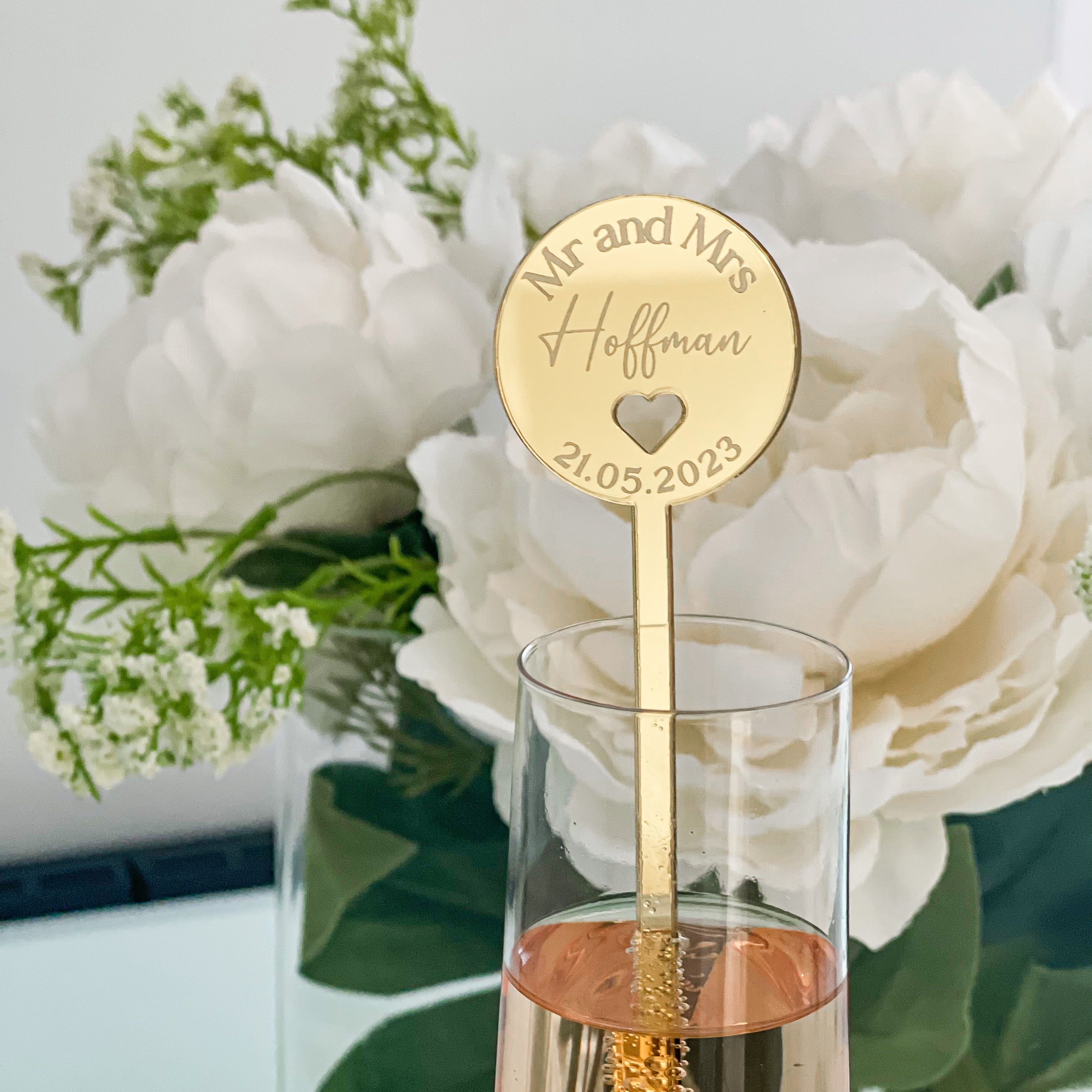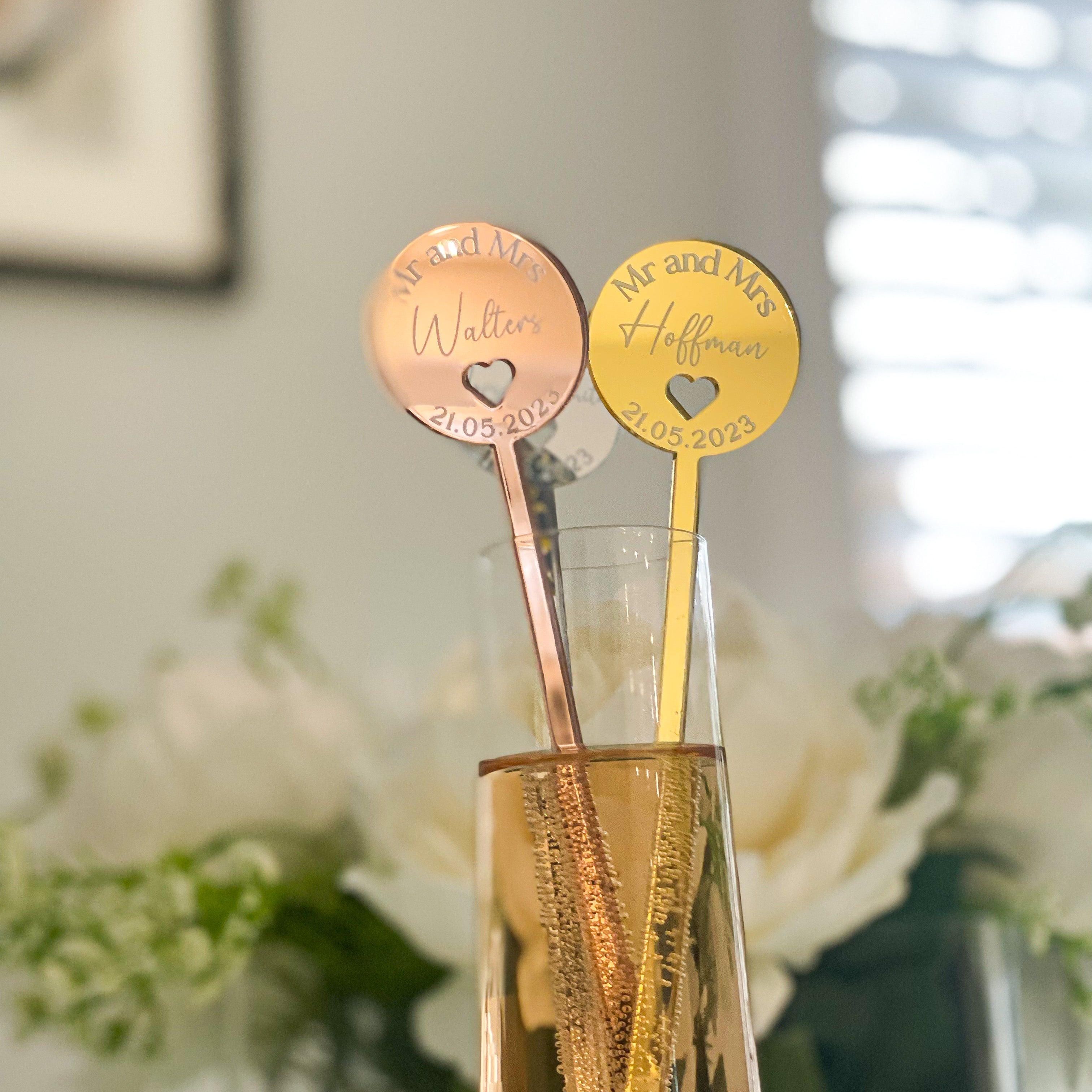 Luxury Luxury Wedding Personalised Drinks Stirrers by PrintLux — crafted from Clear acrylic, Frosted acrylic, Gold mirror, Rose gold mirror, Silver mirror and available in a range of sizes.